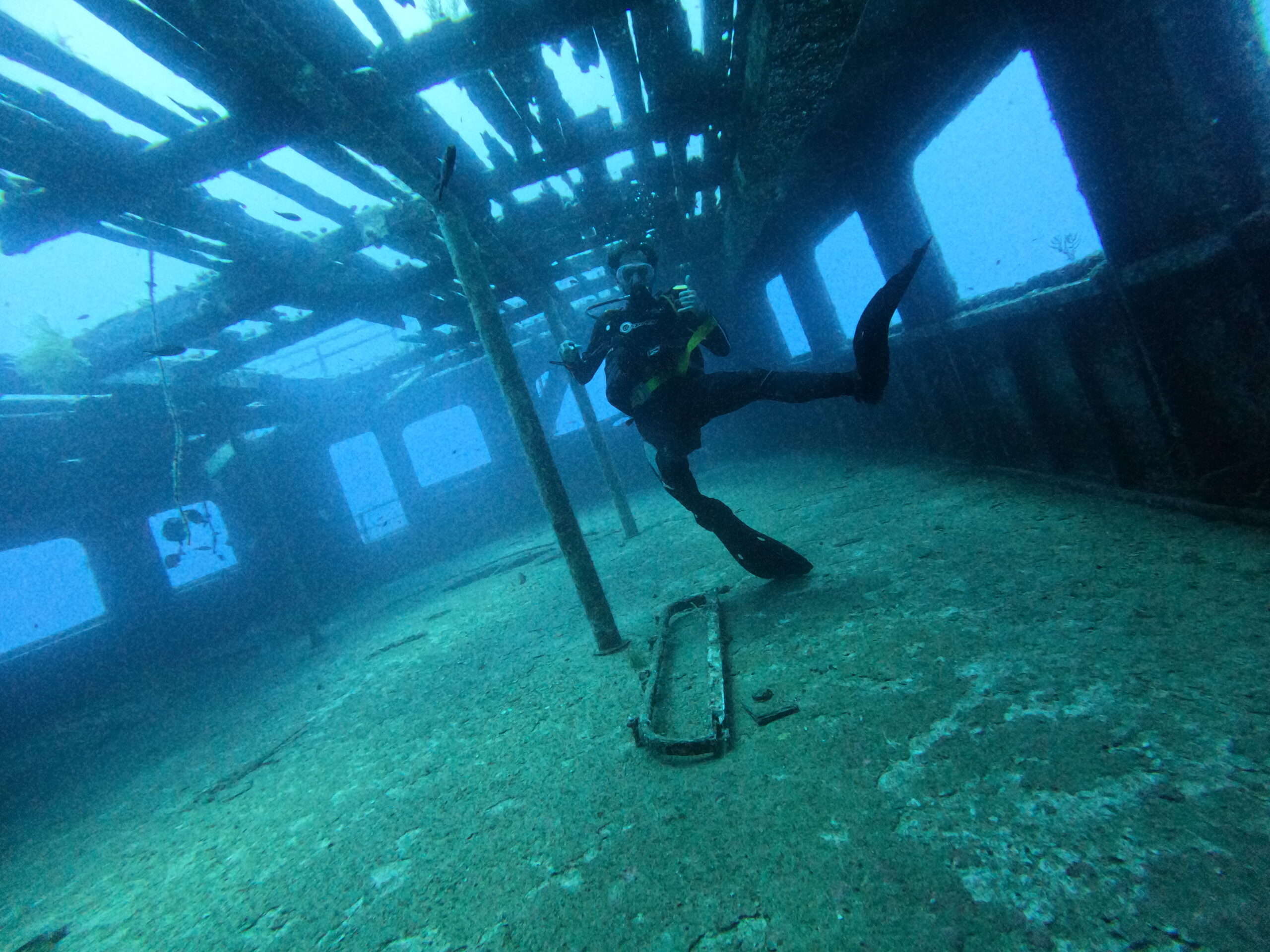 The first wave of divers nervously headed out towards the marker bouys, where they had to put their distance estimation skills to the test and attempt to descend in the correct place between two bouys to come down onto the wreck. Fortunately for me and my diving group, we aced our positioning and came down directly ontop of the mast of the Karwela. Myself and Luke headed straight down to the deck and found the Karwela’s notorious staircase, where we spent the majority of our dive doing a photoshoot while considerably narced. We then headed over the bow to the front of the wreck, then back down to its stern at a shallower depth. Other divers spent considerably longer down on the wreck, exploring the large rooms once stacked with cars during ferry crossings, and the propellers down at the stern. Wanting not to risk entering deco, we headed back towards the shore onto a reef where we had our safety stop. Others did the same, but some had some longer safety stops…. (Tom).
